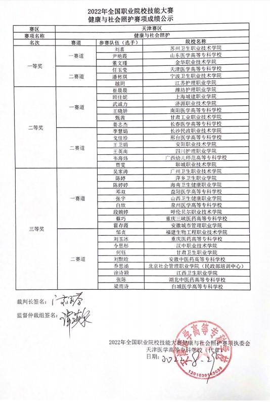 本次賽項于2022年8月26-28日在天津醫(yī)學(xué)高等??茖W(xué)校舉行,吸引了來自全國28個省、自治區(qū)、直轄市的60個院校、60支代表隊的選手和指導(dǎo)老師參賽。全國職業(yè)院校技能大賽高職組健康與社會照護(hù)賽項共分為兩個賽道,每個賽道設(shè)個人一、二、三等獎,獲獎比例分別為 10%、20%、30%,獲得一等獎參賽選手的指導(dǎo)教師將由大賽組委會頒發(fā)優(yōu)秀指導(dǎo)教師證書。